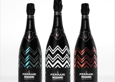 2022. Ferrari Trento and Missoni, two symbolic brands of Made in Italy, collaborate and create a special selection of Ferrari Trentodoc bottles with a matte black background, available in three color variations that feature the iconic zig-zag motif.