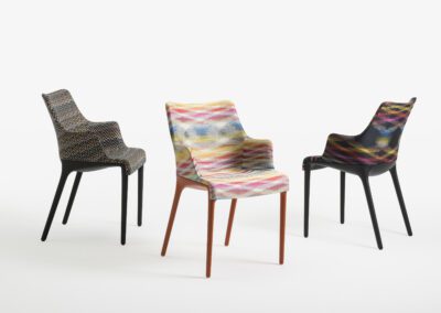 2022. Eleganza Missoni is born, the chair inspired by fashion which bears the name of Eleganza (Elegance) due to its thin and delicate line, resulting from the collaboration between Missoni and the creativity of Philippe Starck for Kartell.